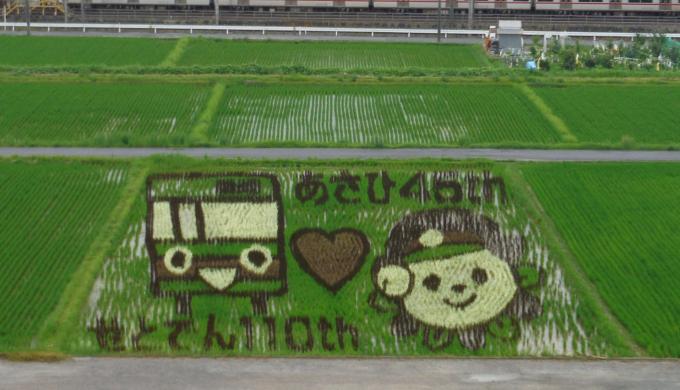 田んぼアートとは、田んぼをキャンバスにして、さまざまな色の稲を使って、巨大な絵や文字を描く事業です。
