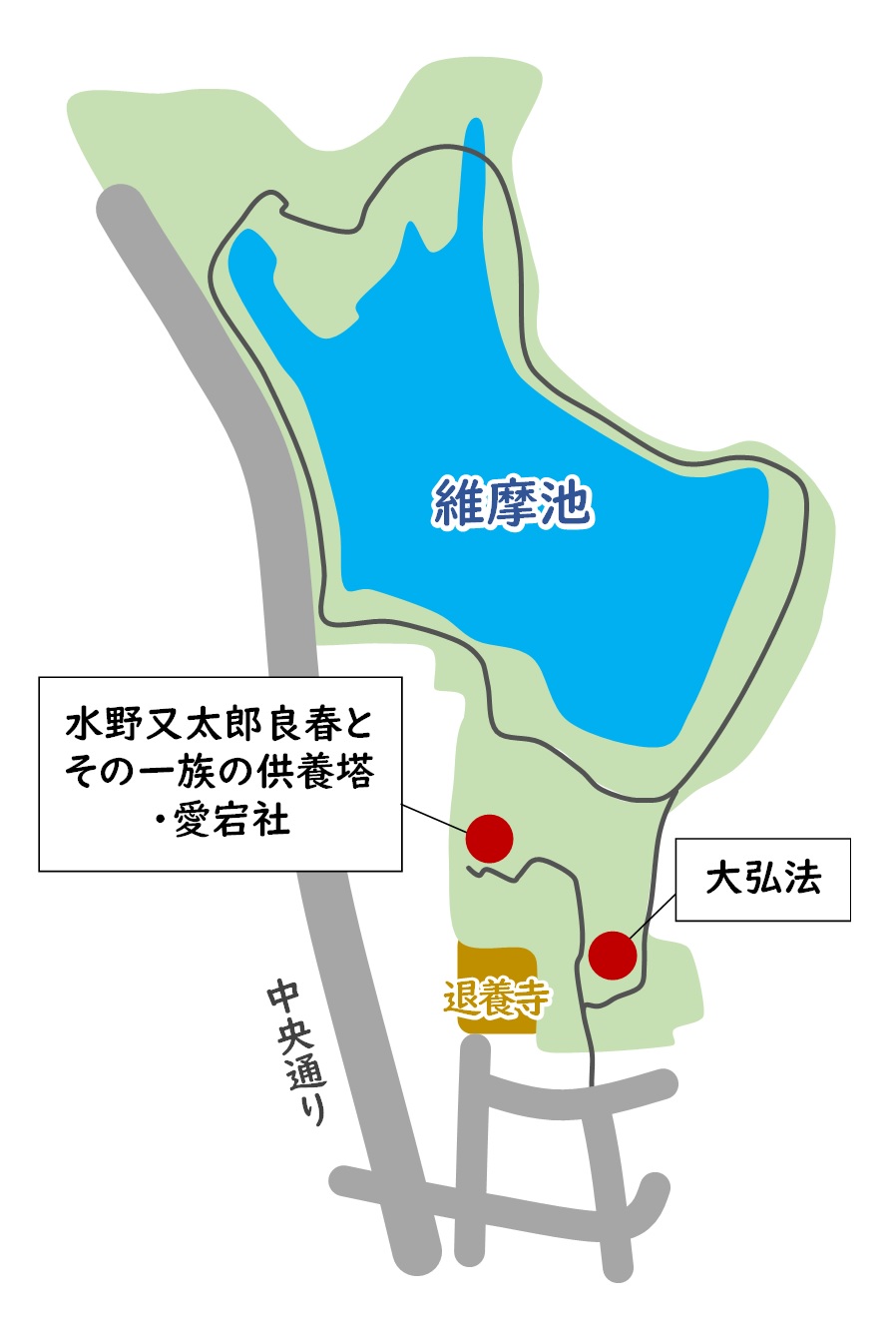 退養寺の東にある丘(通称:愛宕山)に、建っている弘法大師像です。この弘法像は、瀬戸電気鉄道(名鉄瀬戸線の前身)が、当時の新たな観光名所として建立した尾張三大弘法のひとつです。尾張三大弘法の第一番は小幡緑地公園(名古屋市守山区)にある御花弘法、第二番は良福寺(印場元町)にある開運弘法で、第三番が退養寺東の厄除弘法です。地元では親しみをこめて新居の大弘法さんと呼ばれています。