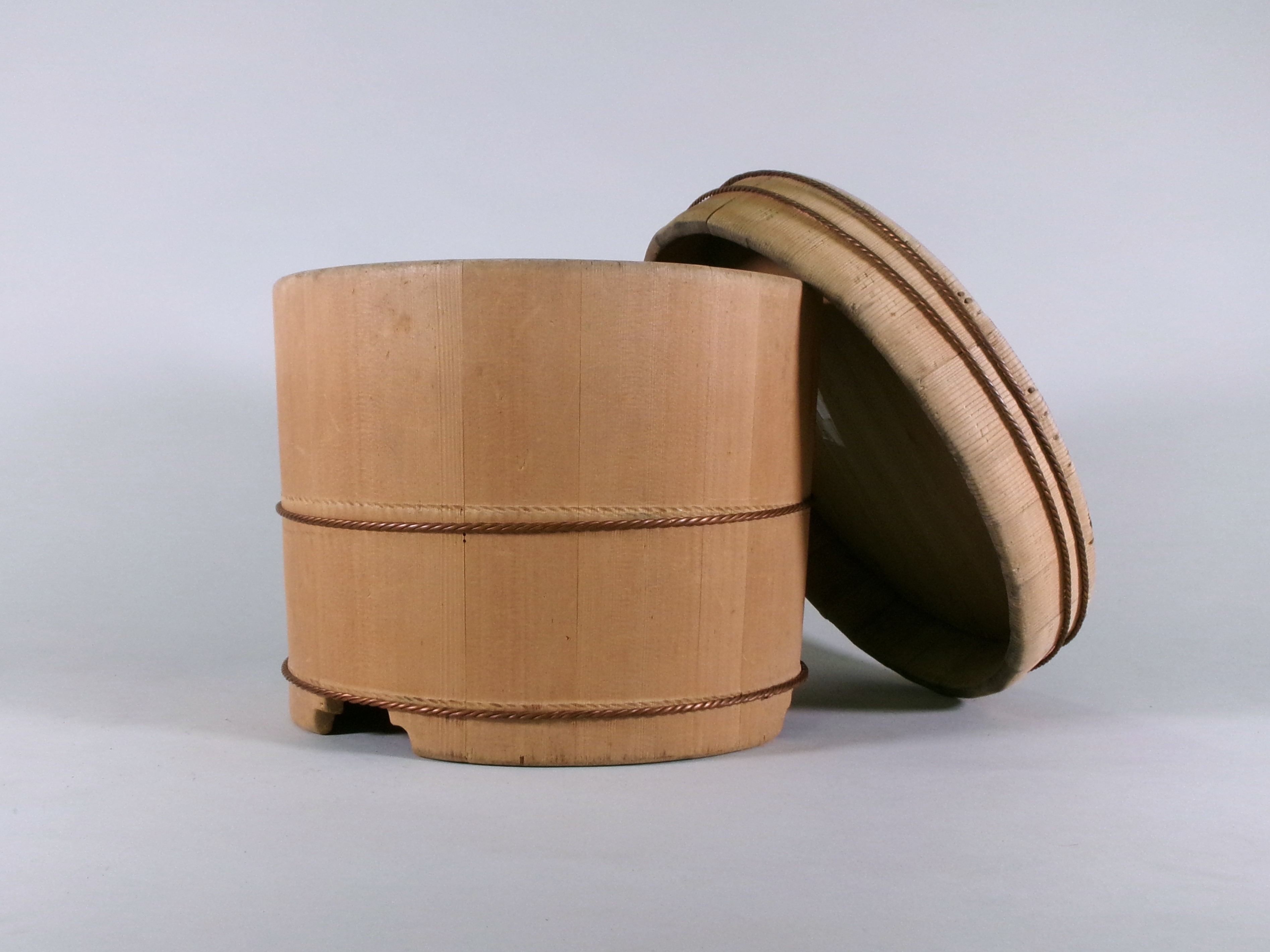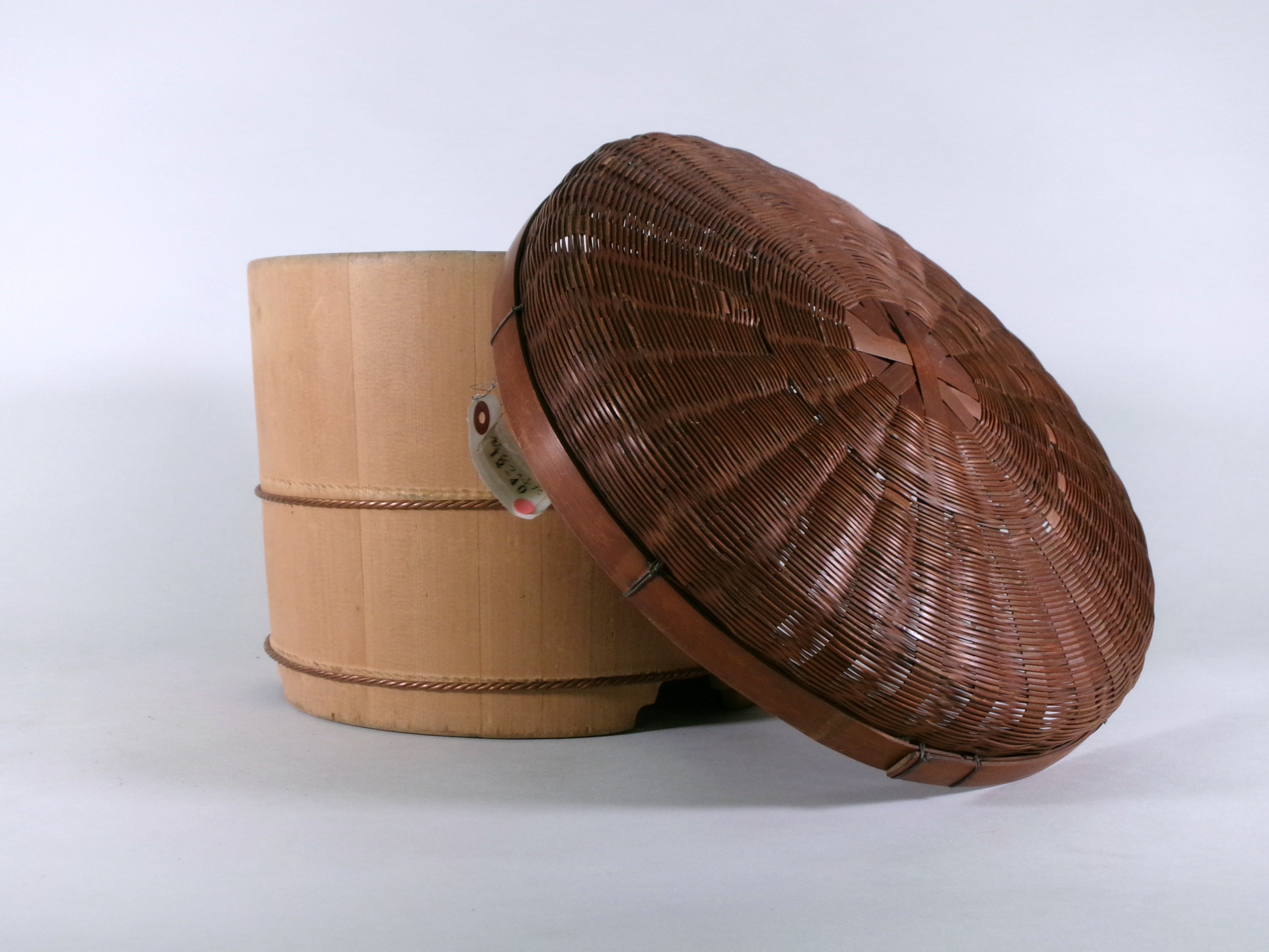 炊き上げたご飯を釜からうつして入れておく容器です。夏は、風通しのよい竹製の蓋を使用しました。