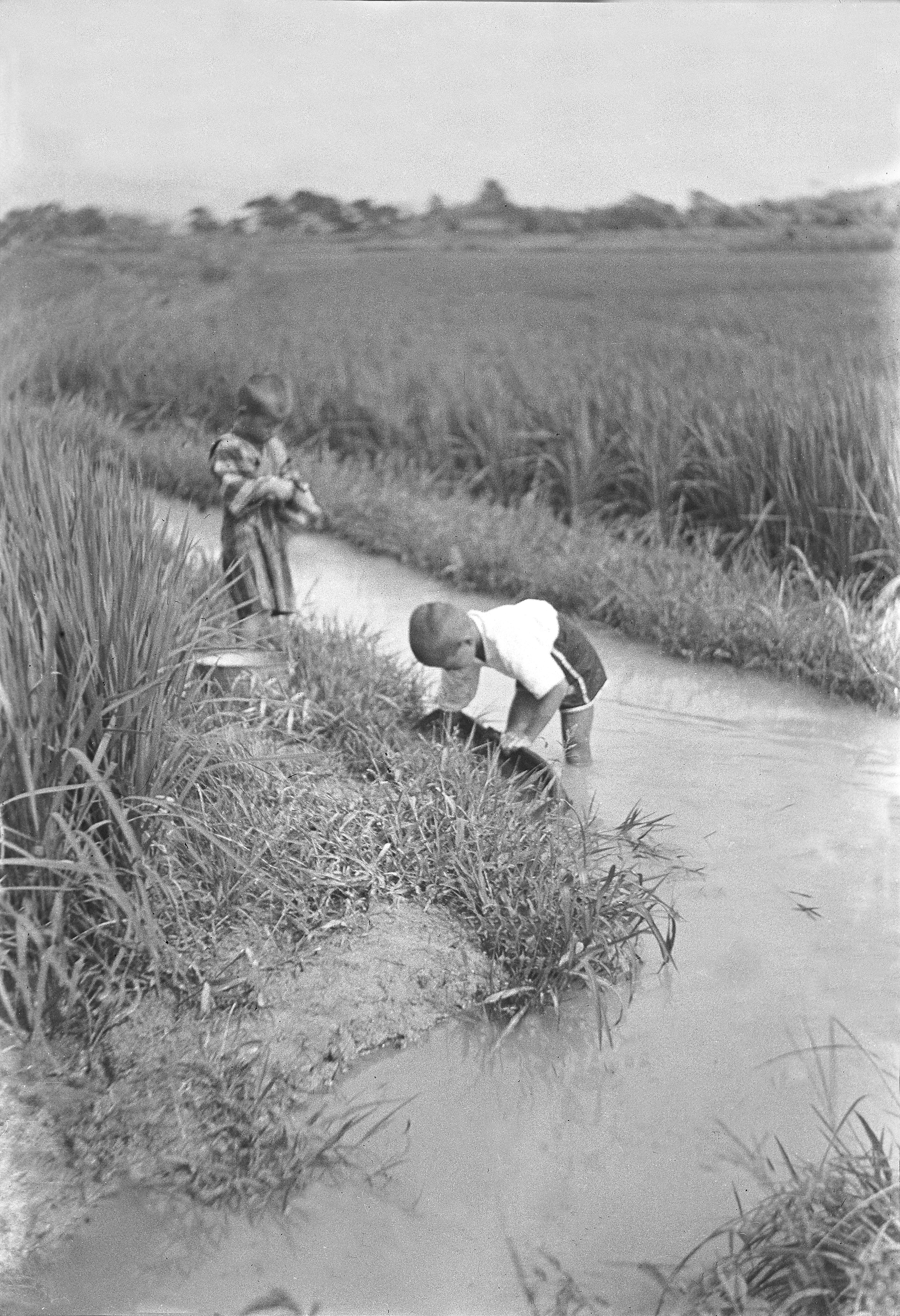 三郷町で採集した写真です。正確な撮影年は分かりませんが、一緒に採集された他の写真の様子から昭和前期のものだと思われます。 「溝(みぞ)」と呼ばれた農業用水でこどもたちがどじょういかきを使っています。当時、溝にはドジョウ、フナ、ナマズなどがおり、どじょういかきやうげ(いげ)を使って捕まえました。大人だけでなく子供たちの夏の楽しみでもあったそうです。