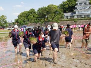 恒例行事となっている「田んぼアート」の田植えに参加しました。14回目になる今年は、「けんこうとし・あさぴー20th」をテーマとしたデザインとなります。学生の皆さんをはじめとした多くの方々が、田植えを体験していました。