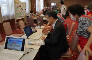 「らくらく筋トレ体操」の効果やポイントを聞きながら参加者も体操を行った後、モデルとなった筋力トレーニングを考案した講師による講演を真剣な表情で聞いてました。