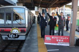 尾張旭駅で、あさぴーがラッピングされた「あさぴートレイン」の発車式が行われました。あさぴーや電車のファンなど、多くの方に見守られながら発車しました。