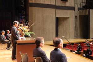 文化会館で令和6年度の市政功労者表彰式が行われました。市政の発展に寄与された個人、団体の方を表彰し、これまでの感謝の気持ちを述べました。